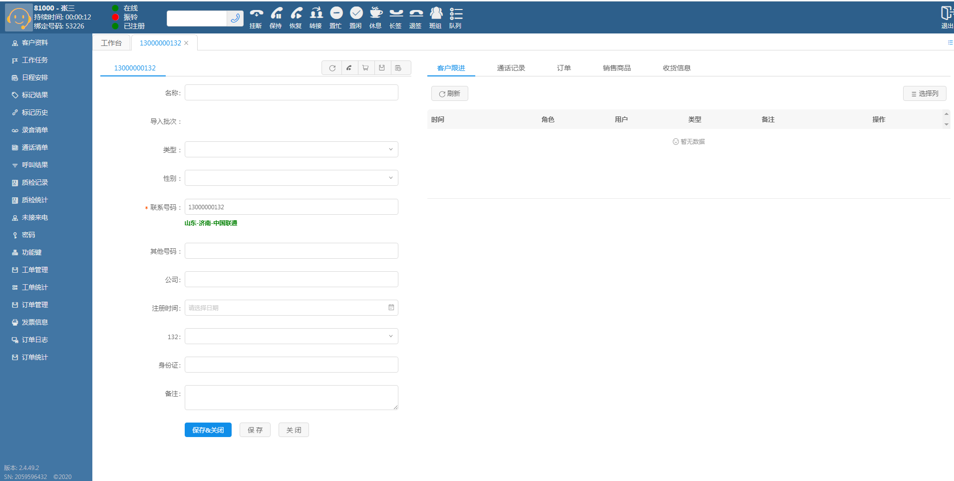 客户来电或呼叫客户时,系统自动弹出客户资料页面,同时展示客户跟进记录。通过弹屏页面信息展示,坐席的服务/营销将更具针对性,并可快速记录当次跟进信息。